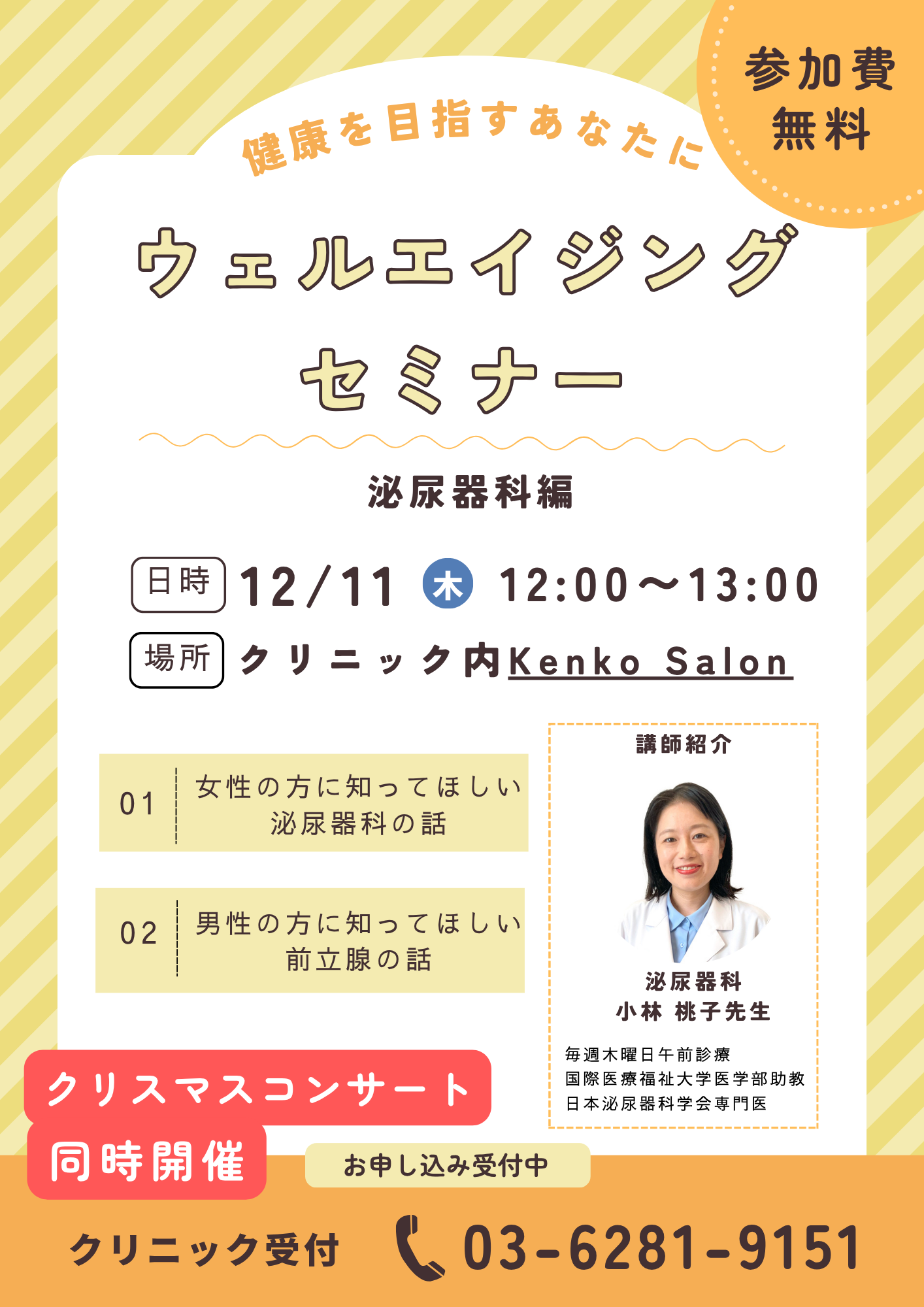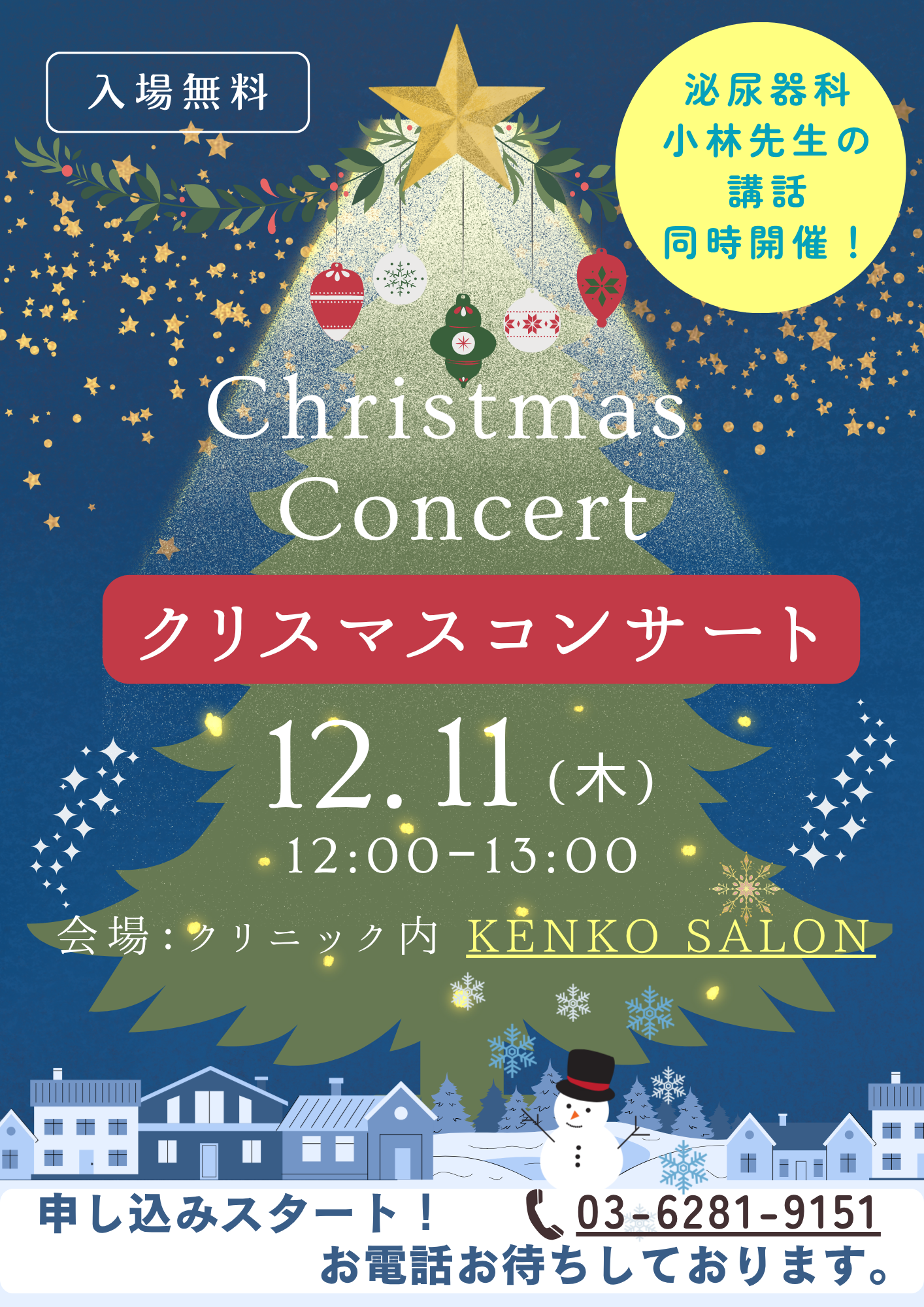 12月11日(木)にクリスマスコンサートを開催します。泌尿器科、小林桃子先生の健康講話があります。当院の患者さんでなくてもご入場いただけます。予約が必要なので、お電話で予約をお願いします。