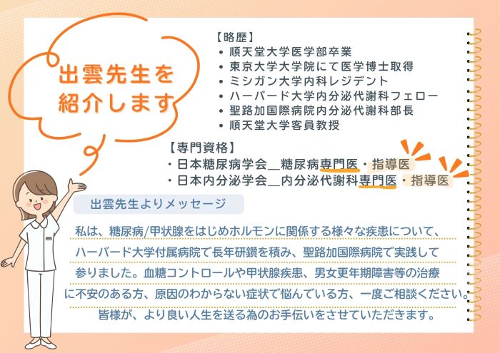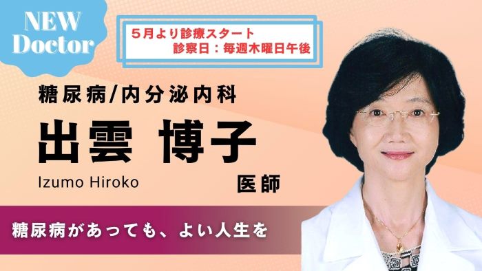 2026年5月より糖尿病・内分泌内科を新設し、出雲博子医師の診察が開始となります。診察日は、毎週木曜日の午後となります。